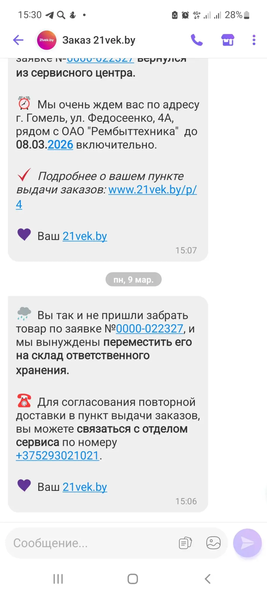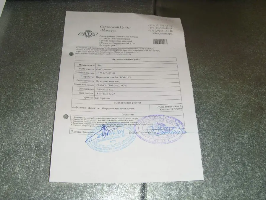 пароочиститель Bort BDR-2700-R. 14 февраля 2026 года я связалась с сервисным центром, рассказала о проблеме в работе пароочистителя: начинает подавать пар, а на 30 секунде работы пароочистителя сила удара пара падает в два раза, ещё через 30 секунд отключается подача пара и начинает работать насос, как будто нет воды в контейнере, через некоторое время возобновляется подача пара. 15 февраля 2026 года был передан пароочиститель в пункт по адресу Федосеенко, 4а. 27 февраля 2026 года из сервисного центра товар вернули в пункт по адресу Федосеенко, 4а без письменного заключения от сервисного центра. В устной форме было сказано, что мной неправильно вставляется контейнер и это явилось причиной неправильной работы пароочистителя. В пункте выдачи я получила грязный пароочиститель и разорванную коробку. Специалисты сервисной службы вымазали мой пароочиститель и нарушили целостность коробки. Специалист пункта и я не смогли установить контейнер до щелчка. Товар был оставлен в пункте для повторной отправки в сервисный центр. Специалист Маргарита связалась со мной и сказала, что сервисный центр просит отправить видео, как я вставляю контейнер. 5 марта 2026 года я со специалистом пункта сняла видео и отправила на номер 375292354196. При этом от 21 века приходило мне сообщение, что мне надо забрать товар в пункте, а 9 марта 2026 года пришло сообщение, что товар передан на склад ответственного хранения. 24 марта 2026 года специалист Маргарита перезвонила мне и сказала, что надо забрать товар, заключение сервисного центра не изменилось. Я попросила письменное заключение сервисного центра, в результате на почтовый адрес мне отправили заключение не по моей заявке. Исходя из вышеизложенного напрашивается следующее: пароочиститель повторно в сервисный центр не отправляли, а хранили на складе. Действия ваших специалистов нанесли мне не только материальный ущерб, но и моральный. Прошу вернуть деньги за приобретенный товар, так как свою функцию он не выполняет