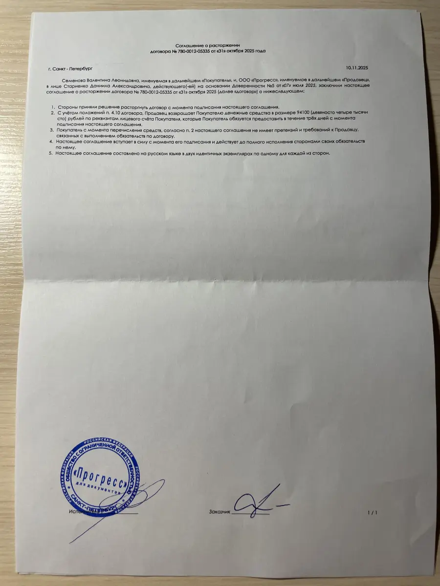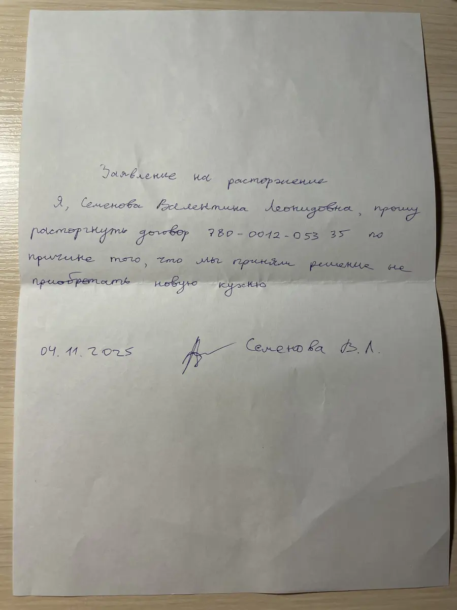 Отвратительная организация, нарушающая все законы. 31 октября 2025 года заключили договор № 780-0012-05335 с компанией Мария, а именно с юридическим лицом ООО "Прогресс" (договоры заключают на разные ООО!). 31 октября внесли предоплату в размере 94 100 руб., чтобы зафиксировать скидки. Дизайнер Даниил обещал, что мы без проблем вернем предоплату в случае отказа в соответствии с законодательством. Замерщик не приезжал, никаких услуг оказано не было. Не устроила итоговая сумма кухни и договор был расторгнут. 04.11.2025 написала заявление на возврат предоплаты, но деньги не получила. Стала звонить в салон: сказали "Мы разберемся и перезвоним", но никто так и не перезвонил. 10.11.2025 также подписала соглашение о расторжении, которое мне забыли дать подписать 4 ноября. Уже 3 декабря, денег так и нет. На горячей линии кормят обещаниями. Претензии оставлять бесполезно, не перезванивают. Чек на возврат денежных средств не получить, нарушают Налоговый кодекс. Управляющая салоном не отвечает на звонки в ее рабочее время. В личном кабинете покупателя договор исчез. Денежные средства по закону должны были вернуть в течение 7 дней!