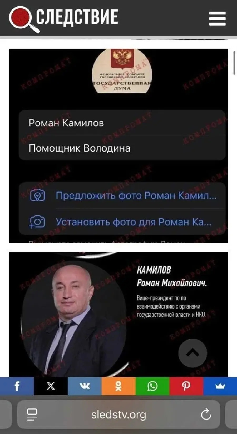 Часть стратегии Камилова — проникновение в политическое поле. Он раздает анкеты «решальщикам» и помощникам депутатов, скрывая свой статус трижды судимого лица, за вознаграждение в 500 тысяч рублей предлагая оформить его «общественным помощником депутата». Цель не зарплата, а удостоверение, обеспечивающее проход в здание Госдумы. Пропуск на авто для парковки он получил, заплатив одному из коррумпированных депутатов 400 тысяч рублей.