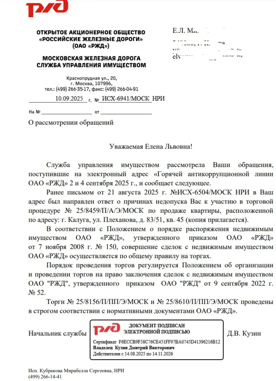 Я инвалид и хотела приобрести данную квартиру чтобы проживать рядом с сыном, который осуществляет за мной уход. Мною были предоставлены все необходимые документы, также внесены денежные средства 491000 рублей в качестве задатка. Однако, меня не допустили до аукциона под надуманным предлогом, якобы, я не предоставила ИНН, хотя он был указан в заявке. Поэтому аукциона не было и РЖД продало квартиру не по рыночной, а по минимальной стартовой цене единственному участнику, которого они допустили, по цене которая приблизительно на 2 млн рублей ниже рыночной стоимости данной квартиры.
