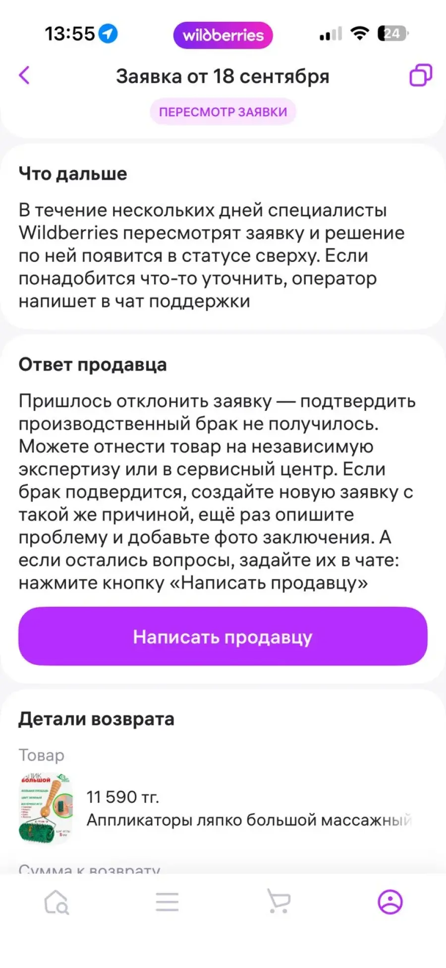 16 сентября получила товар на пункте выдачи Вайлдберрис в Астане по адресу Сауран 14, в пункте выдачи было плохое освещение, не заметила сразу что товар, который я заказала, артикул 111557890, Апликатор ляпко большой массажный валик с иголками приехал использованный, со следами отмершей кожи и другого прилипшего мусора. На заявку продавец ответил отказом. Я считаю, что этонеприемлемо, так как через такой товар с иголкамиможно и заразиться. 18 сентября направила заявку на возврат, а далее на пересмотр вайлдберрис, на что они до сих пор не ответили, спустя десять дней.