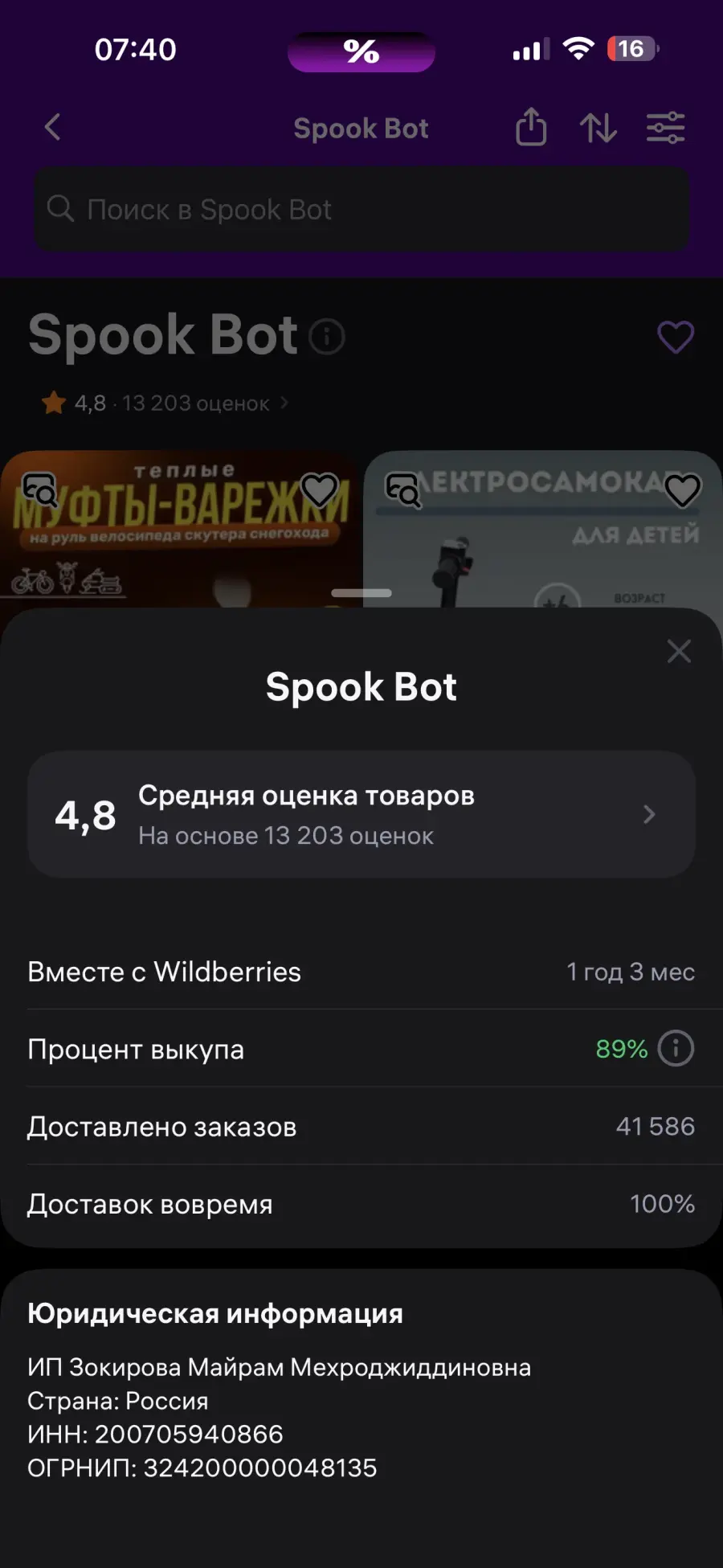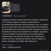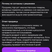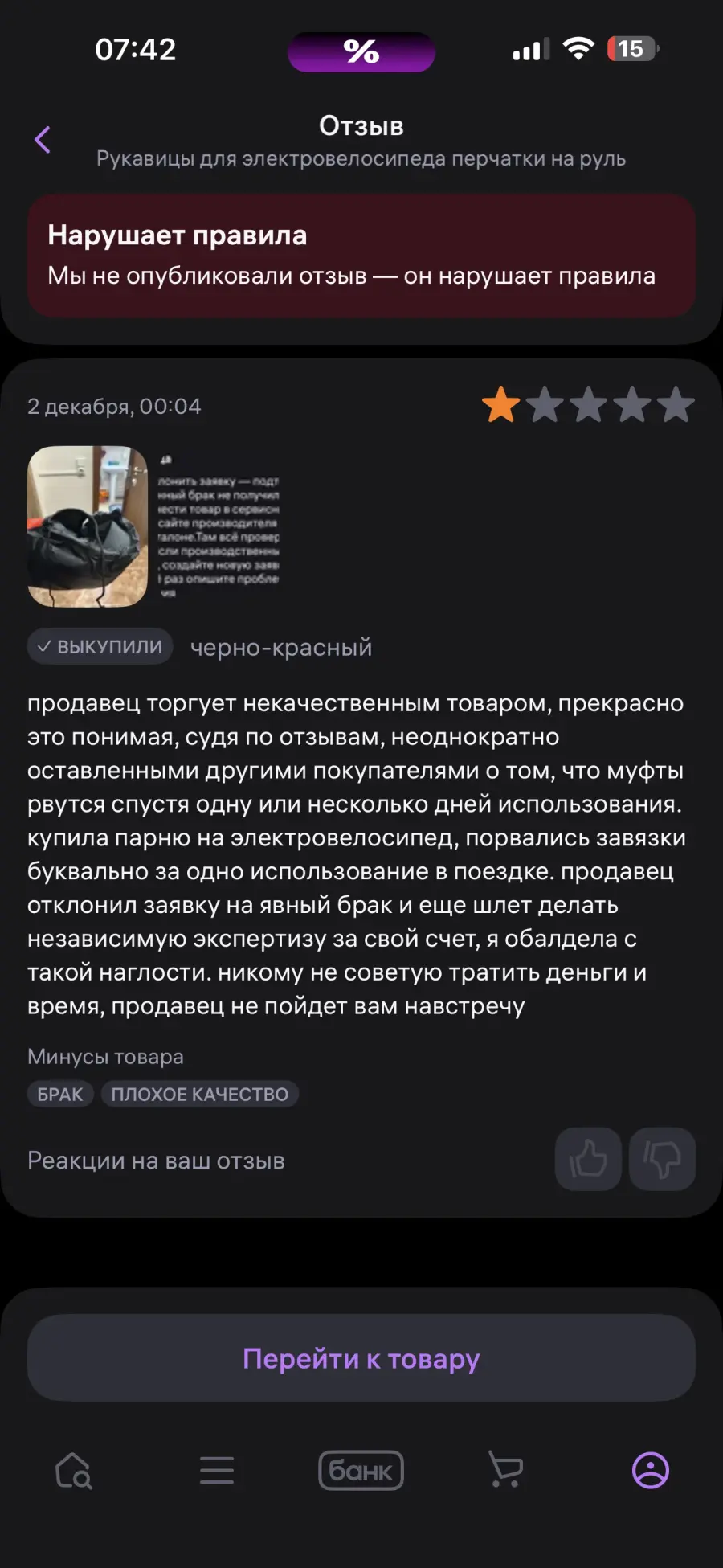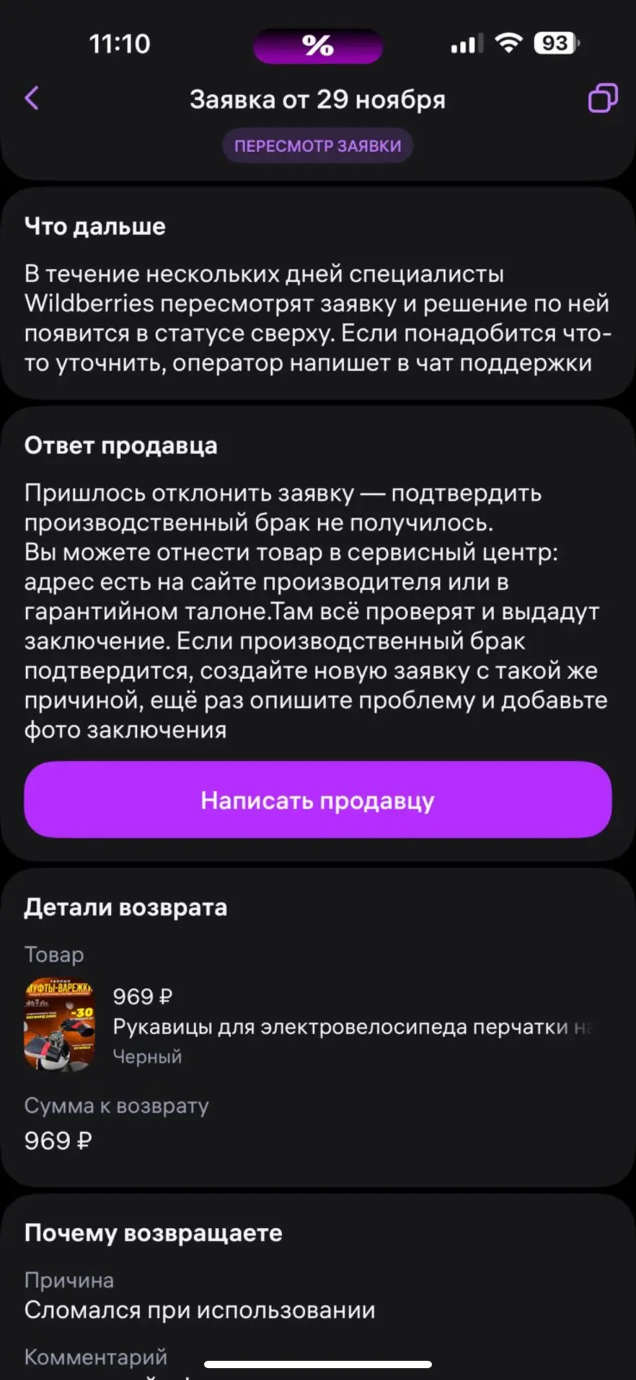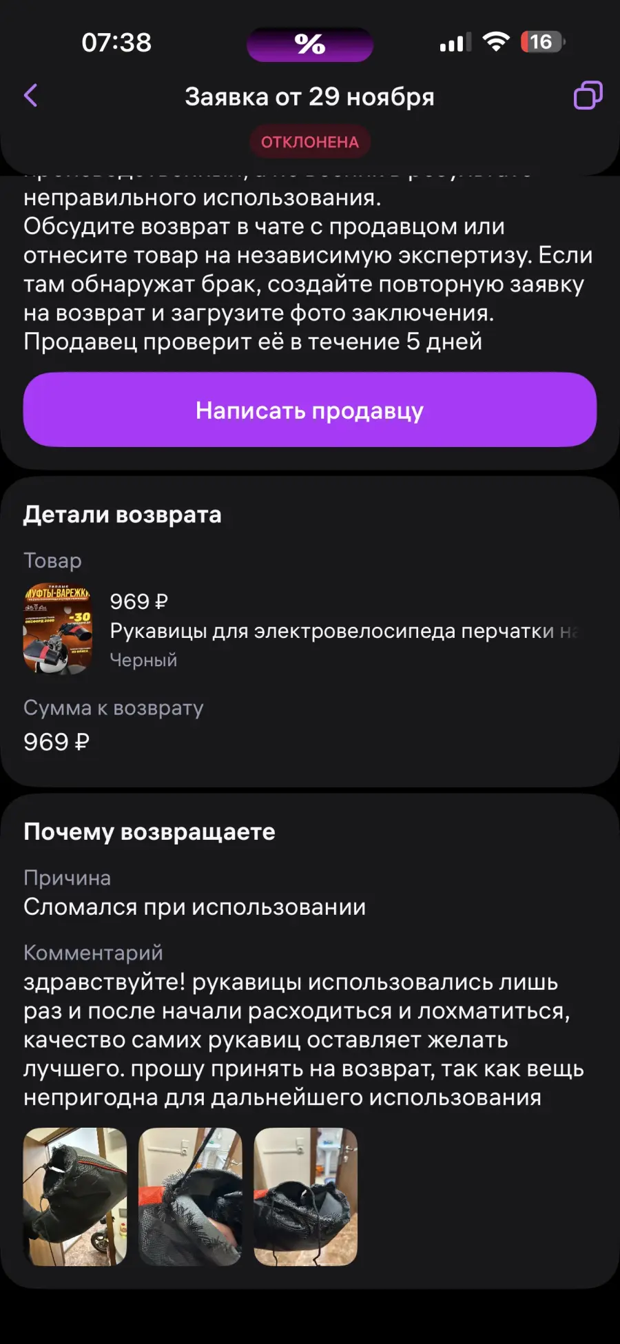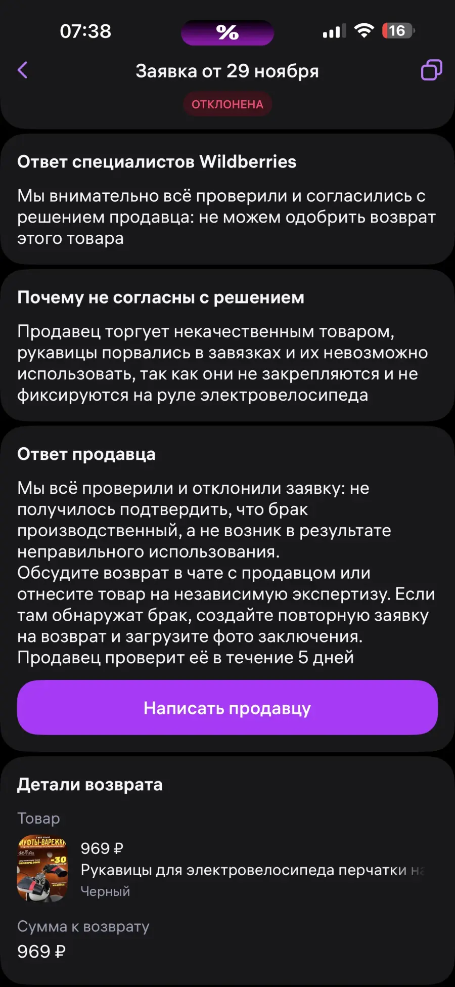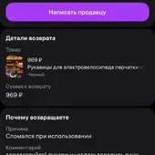 Купила рукавицы для электровелосипеда парню, через день порвалась одна перчатка, заявку продавец отбраковывает, отписываясь как о сложнотехническом товаре. По отписке продавца я должна нести эти рукавицы в СЕРВИСНЫЙ ЦЕНТР на диагностику, хотя это ВЕЩЬ, а не ЭЛЕКТРОНИКА. После продавец уже изменил свой ответ, видимо, подсказал это сам Wildberries, что так же доказывает недобросовестность как продавца, так и компании. На моих фото прекрасно виден факт брака товара и некачественного пошива вещи, что полностью игнорируется и продавцом и компанией, так как продавец не желает терять денежки и таким образом незаконно наживается на покупателях. Прекрасно видно, что продавец изначально торгует некачественным товаром и Wildberries покрывает недобросовестного продавца, даже не пропуская отзыв о некачественном товаре, хотя мой отзыв не нарушает правила. Сколько еще подобных продавцов покрывает компания, забывая о справедливости?